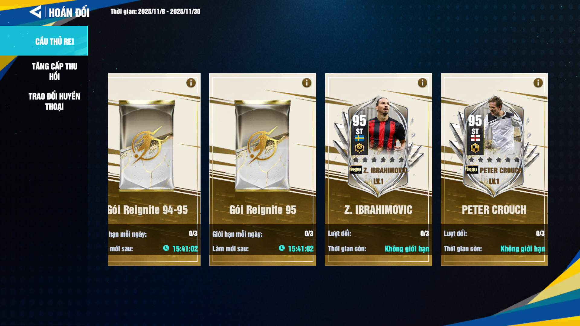 Đồng hành cùng mùa thẻ mới là sự kiện Hoán đổi Cầu thủ Mùa thẻ REIGNITE cho anh em tha hồ sở hữu cầu thủ REIGNITE yêu thích.