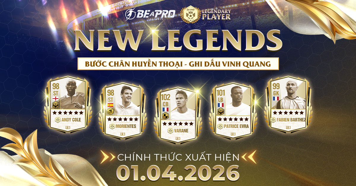 Mùa thẻ Huyền thoại (Legend) trong Be A Pro: Football luôn là khao khát lớn nhất của mọi huấn luyện viên khi xây dựng "Dream Team". Nhằm mang đến những trải nghiệm bóng đá đỉnh cao và bổ sung thêm các mảnh ghép chất lượng cho đội hình, đợt ra mắt huyền thoại tháng 4 này sẽ chính thức trình làng 5 cái tên kiệt xuất mới. Từ những cỗ máy săn bàn khét tiếng cho đến những "hòn đá tảng" không thể xô đổ nơi hàng phòng ngự, tất cả đã sẵn sàng viết tiếp vinh quang trên sân cỏ ảo.