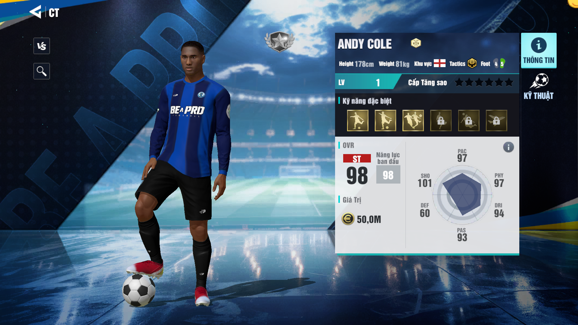 Đứng thứ tư trong danh sách những cây săn bàn vĩ đại nhất lịch sử Ngoại hạng Anh với 187 pha lập công, Andy Cole là một sát thủ vòng cấm đích thực. Anh sở hữu bản năng đánh hơi bàn thắng nhạy bén, tốc độ bứt tốc chớp nhoáng và khả năng dứt điểm lạnh lùng ở mọi tư thế. Đỉnh cao sự nghiệp của Cole gắn liền với cú ăn ba lịch sử năm 1999 cùng Quỷ đỏ thành Manchester. Trong game, khi được đặt vào chiến thuật "Cơn lốc đường biên", Andy Cole sẽ là điểm cắt hoàn hảo cho những pha phất bóng tốc độ từ hai cánh, biến mọi đường chuyền thành cơ hội ăn bàn rõ rệt.
