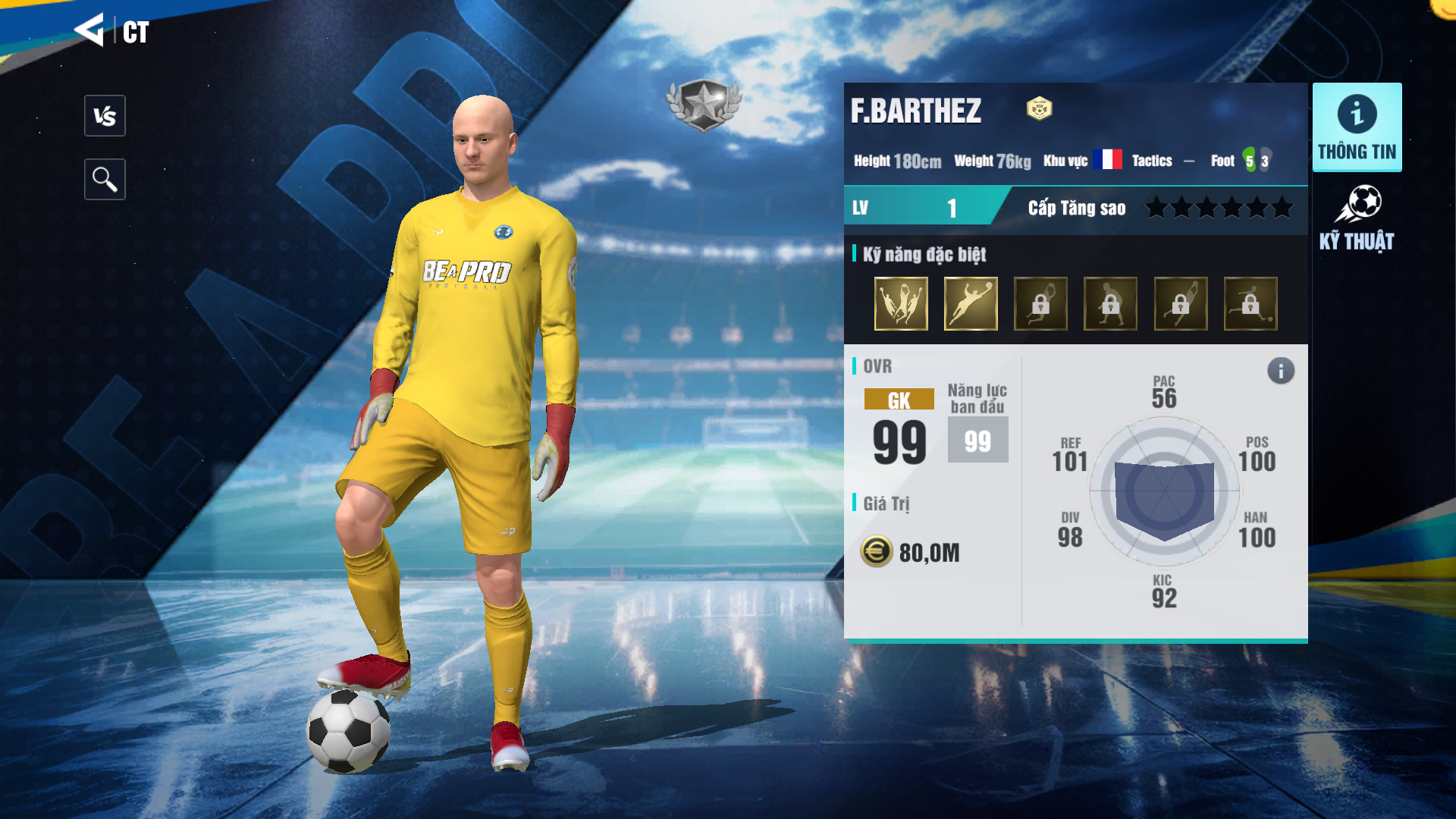 Nhắc đến thế hệ vàng của bóng đá Pháp cuối thập niên 90, không thể không nhắc đến Fabien Barthez – "người gác đền" có phong cách thi đấu đầy cá tính và tài năng vượt trội. Anh là nhân tố chủ chốt giúp Les Bleus vô địch World Cup 1998 và Euro 2000, đồng thời từng nâng cao chiếc cúp Champions League cùng Marseille và vô địch Ngoại hạng Anh cùng Man Utd. Barthez nổi bật với phản xạ xuất thần, những pha bay người cứu thua không tưởng và khả năng xử lý bóng bằng chân vô cùng tự tin. Sở hữu OVR 99, Barthez chắc chắn sẽ là chốt chặn vững chắc, mang lại sự an tâm tuyệt đối cho khung gỗ của đội nhà.