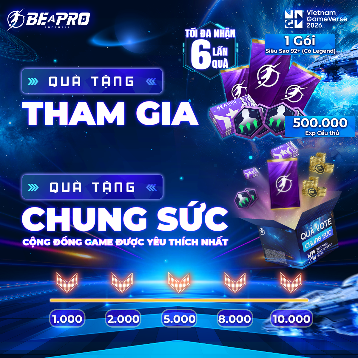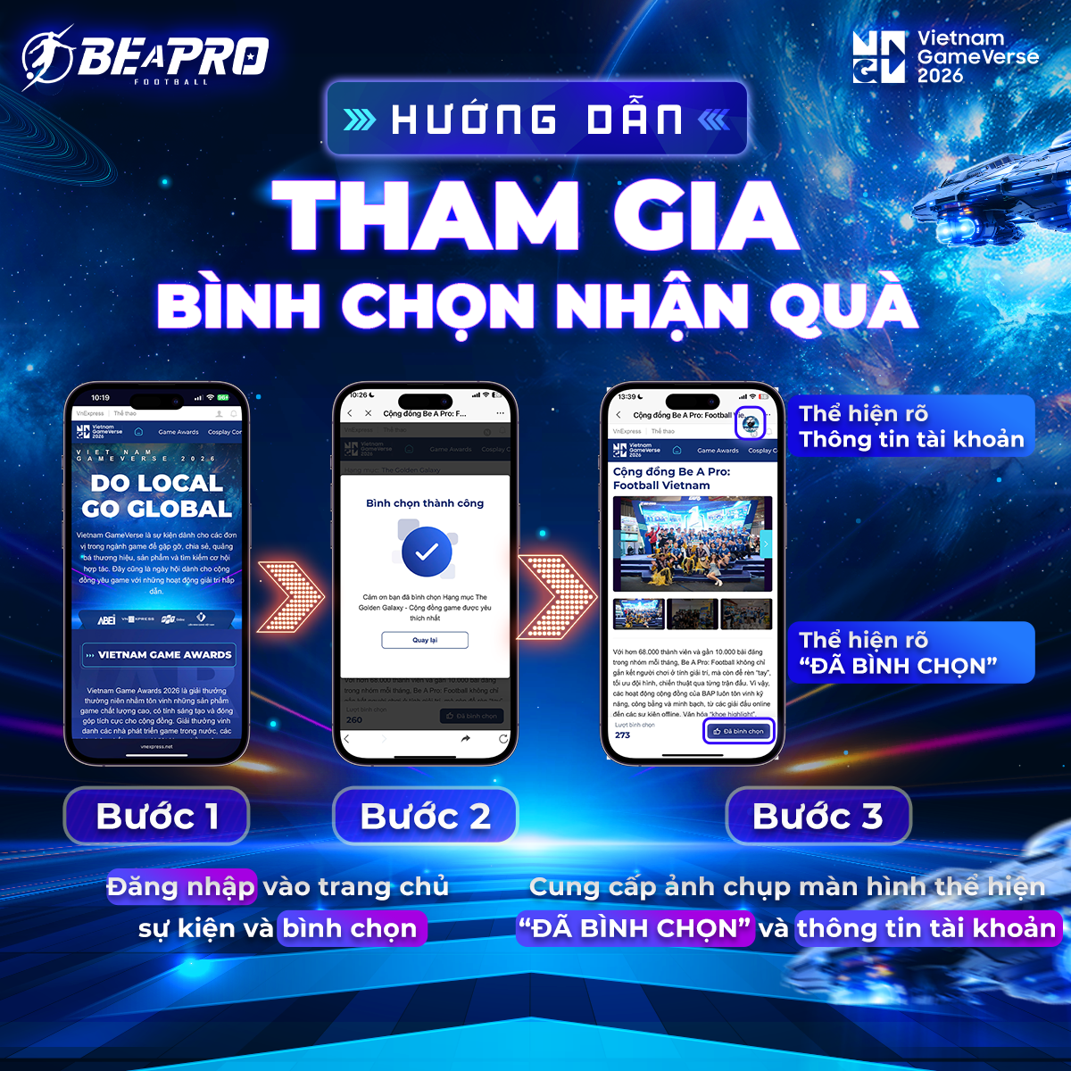 Giải thưởng Game Việt Nam - Vietnam Game Awards 2026 đã chính thức khởi tranh! Đây là thời khắc quan trọng để cộng đồng chúng ta cùng nhau chung sức, khẳng định sức mạnh và tình yêu mãnh liệt dành cho Be A Pro: Football tại hạng mục Cộng đồng game được yêu thích nhất.